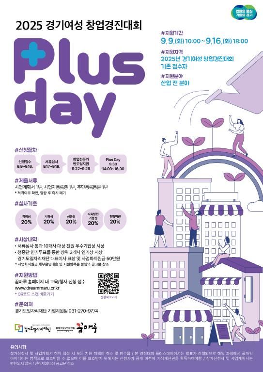 [한국기자연대] 경기도와 경기도일자리재단은 9월 9일부터 16일까지 2025년 여성창업경진대회 후속 행사인 ‘Plus Day(플러스 데이)’ 참가자를 모집한다. 이번 행사는 지난 5월 본 대회에서 17대 1의 높은 경쟁률로 아쉽게 탈락한 여성 창업자를 대상으로 마련됐다.