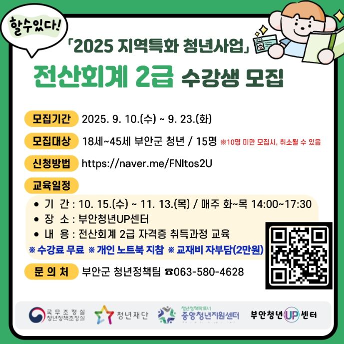 [한국기자연대] 부안청년UP센터는 지역 청년들의 회계 실무 능력 향상과 전문 자격 취득을 지원하기 위해 오는 10월부터 운영할 전산회계 2급 자격증반 수강생을 모집한다.