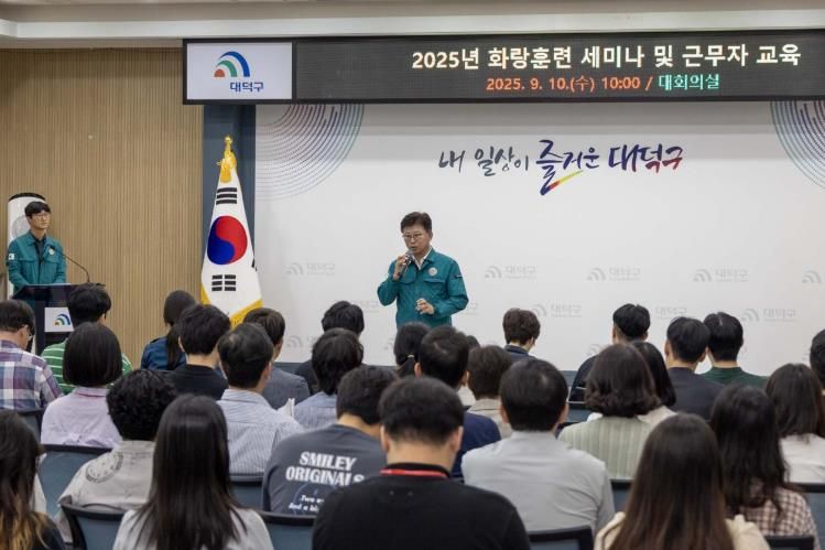 [한국기자연대] 대전 대덕구는 10일 구청 대회의실에서 직원 100여 명이 참석한 가운데 ‘2025년 화랑훈련 대비 세미나 및 근무자 교육’을 실시했다고 밝혔다.