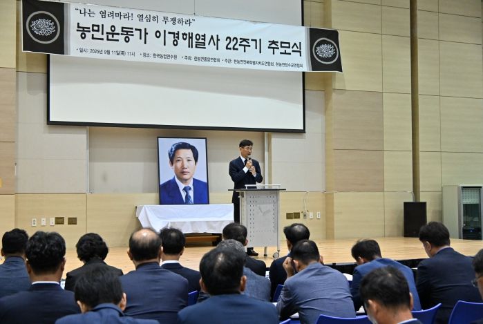 [한국기자연대] 장수군은 (사)한국농업경영인중앙연합회 주관으로 11일 장수읍 한국농업연수원에서 장수 출신 농민운동가 故이경해 열사의 22주기 추모식을 거행했다고 밝혔다.