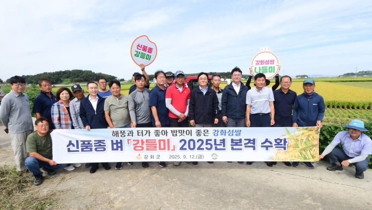 [한국기자연대] 강화군은 12일 교동면 삼선리에서 신품종 조생종 벼 ‘강들미’ 수확 행사를 열었다.