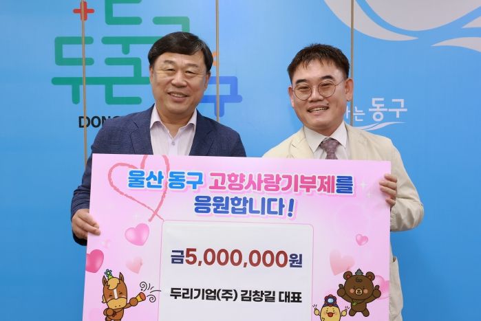 ㈜두리기업은 첨단 신소재 물탱크 및 저장 용기 분야에서 글로벌 경쟁력을 갖춘 기업으로, 김창길 대표는 지난해에도 동구 내 저소득층 지원금과 고향사랑기부금을 꾸준히 기탁하는 등 기업 이익을 지역사회에 환원하는 나눔 경영을 실천하고 있다.