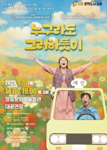 [한국기자연대] 장흥군은 공연장협력예술단체 창작연극 ‘누구라도 그러하듯이’ 공연을 오는 9월 25일 14시, 19시 2회에 걸쳐 장흥문화예술회관에서 개최한다.