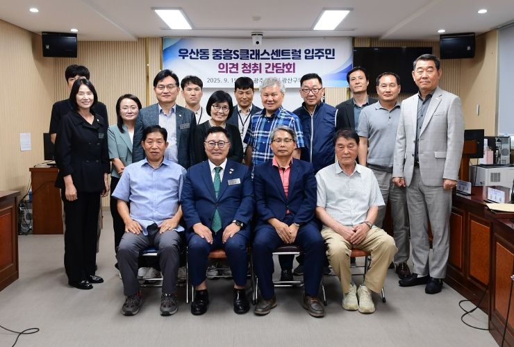 [한국기자연대] 김명수 광산구의회 의장(더불어민주당, 신흥동·우산동·월곡1·2동·운남동)이 15일 우산동 선수촌 중흥S클래스의 말미산 토사 유출 등으로 인한 피해를 근본적으로 예방하기 위해 주민들의 의견을 청취하는 간담회를 개최했다.