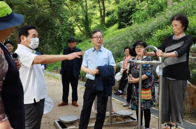 반가워하던 주민들은 곧이어 유 구청장에게 어려움을 꺼내놓았다. 이 근방에 산다는 황충관(80) 씨는 “이곳에서 매일 30~40명이 정기적으로 운동을 한다”며 “다만 지붕이 없어 비가 올 때는 어쩔 수 없이 운동을 쉬어간다”고 아쉬움을 토로했다. 시흥2동 주민인 이연옥(67) 씨 역시 “안전하게 운동을 하고 싶다”며 “일부 빗물에 흙이 떠내려가 바닥이 패인 곳도 있다”고 설명했다.