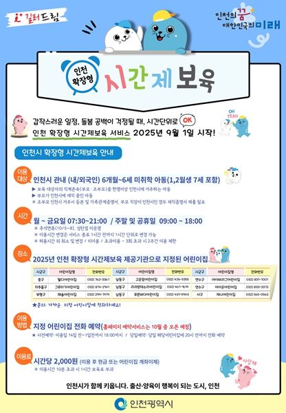 한편, 이번 ‘아이플러스(i+) 길러드림’ 확장형 시간제 보육은 인천시가 추진하는 저출생 극복을 위한 ‘아이플러스(i+) 출생정책 6종(이어드림, 맺어드림, 1억드림, 집드림, 차비드림, 길러드림) 시리즈’중 하나로, 생애주기별 맞춤형 지원을 통해 아이 낳고 키우기 좋은 도시 조성에 기여할 것으로 기대된다.