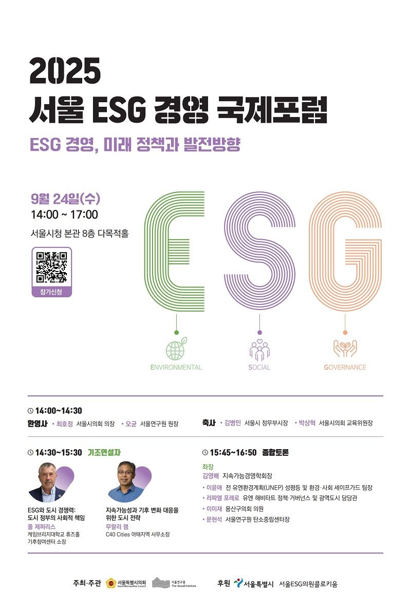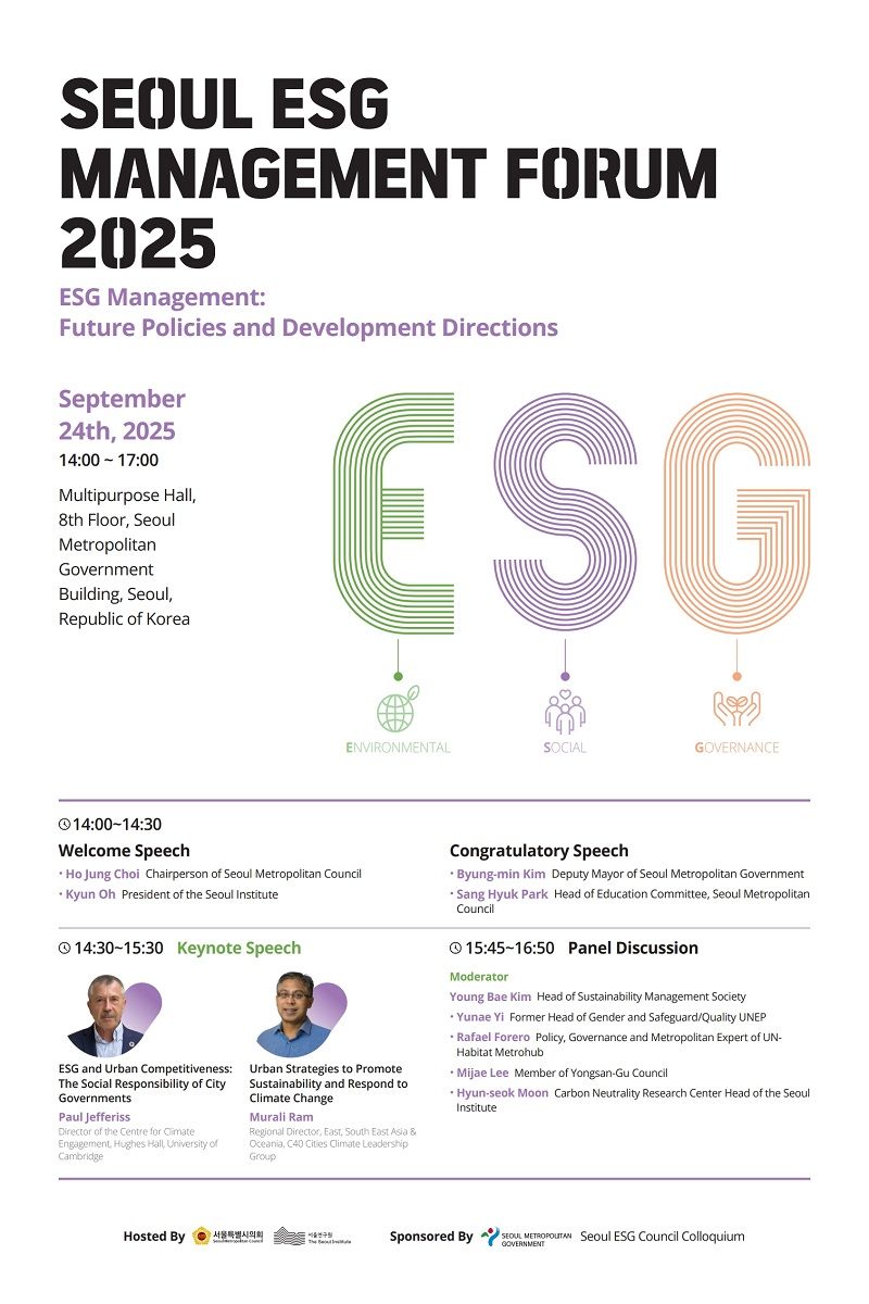 [한국기자연대] 서울연구원(원장 오균)은 9월 24일 오후 2시부터 서울시청 본청 8층 다목적홀에서 ‘ESG 경영, 미래 정책과 발전방향’을 주제로 서울특별시의회와 서울연구원이 공동주최하고, 서울특별시와 서울ESG의원콜로키움이 후원하는 제3회'2025 서울 ESG 경영국제포럼'을 개최한다.