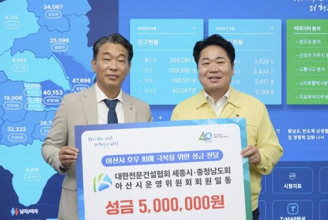 [한국기자연대] 아산시는 17일 대한전문건설협회 세종시⸱충청남도회와 아산시 운영위원회로부터 집중호우로 인한 피해 주민을 돕기 위해 모금한 성금 5백만 원을 전달받았다고 밝혔다.