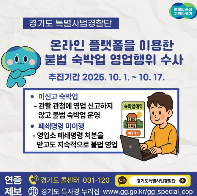 [한국기자연대] 경기도가 10월 1일부터 17일까지 3주간 온라인 공유 숙박 플랫폼을 이용해 오피스텔 등에서 불법 숙박업을 운영하는 미신고 업소를 집중 단속한다.