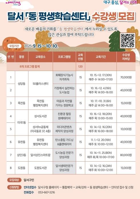 수강 신청은 달서구청 홈페이지에서 가능하며, 선착순으로 조기 마감될 수 있다.