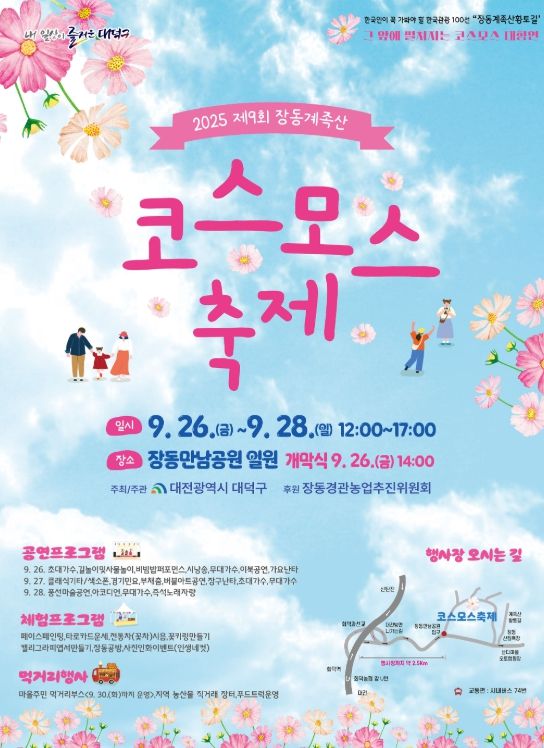 최충규 대덕구청장은 “지역의 자연과 문화, 그리고 주민들의 정성이 함께 어우러져 만들어진 이번 ‘장동계족산 코스모스축제’가 주민과 관광객 모두에게 오래도록 기억될 뜻깊은 시간이 되기를 바란다”며 “많은 분이 찾아와 도심 속에서 가을의 낭만을 만끽하시길 바란다”고 말했다.