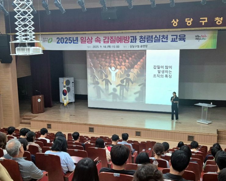 [한국기자연대] 청주시는 18일 상당구청 공연장에서 청주시 직원 300명을 대상으로 일상 속 갑질 예방과 청렴 실천 교육을 실시했다.