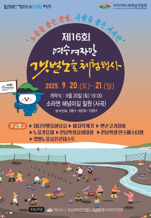 정기명 시장은 “여자만의 갯벌과 노을을 배경으로 한 이번 행사는 단순한 축제를 넘어 자연과 사람, 환경이 어우러지는 의미 있는 시간으로 준비했다”며 “많은 시민과 관광객이 안전하고 즐겁게 참여해 가을의 낭만과 함께 여수의 매력을 만끽하시길 바란다”고 말했다.