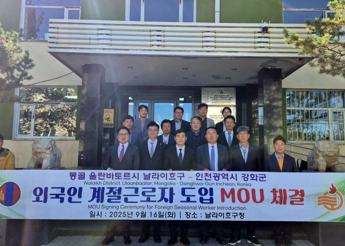 [한국기자연대] 강화군은 지난 16일, 몽골 울란바토르시 날라이흐구를 공식 방문해 ‘외국인 계절근로자 도입에 관한 협약(MOU)’을 체결했다고 밝혔다.