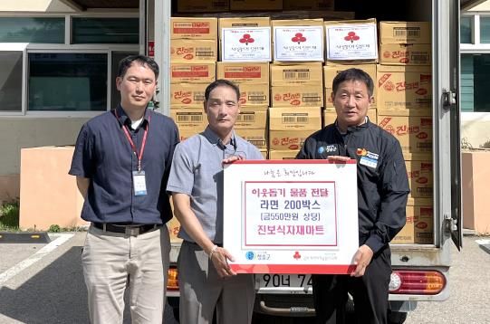 [한국기자연대] 청송군은 지난 17일 추석 명절을 앞두고 진보면 소재 진보식자재마트(대표 박건)에서 550만 원 상당의 라면 200상자를 진보면에 기탁받았다고 밝혔다.