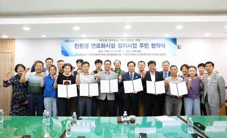 19일 완주군은 군청 전략회의실에서 화산면 운곡리 수실·돈의·부현마을 주민, 전주김제완주축산업협동조합, 친환경 연료화시설 설치사업 지속발전협의회와 함께 ‘친환경 연료화시설 설치사업 주민 협약’을 체결했다.