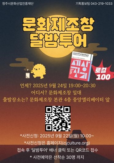[한국기자연대] 청주시문화산업진흥재단이 22일 오전 10시부터 ‘문화제조창 달밤투어’ 9월의 두 번째 투어객 모집에 들어간다.