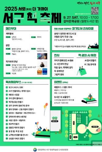 [한국기자연대] 대전 서구는 이달 27일 월평도서관 옆 갈마문화공원에서 ‘2025 서구 책 축제(부제: 서로(書路) 더 가까이)’를 개최한다.