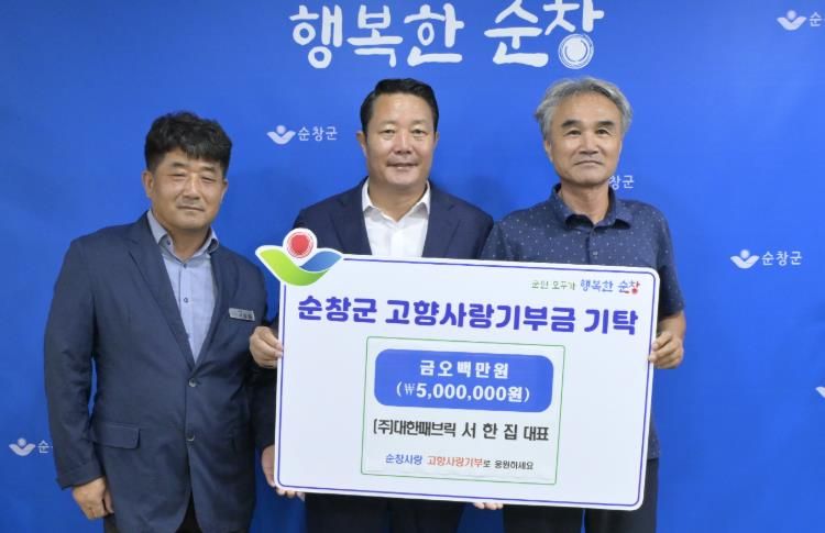 [한국기자연대] 순창 출신 기업인 (주)대한패브릭 서한집 대표이사가 23일 순창군에 고향사랑기부금 500만원을 전달하며 올해로 3년째 고향사랑을 실천했다.