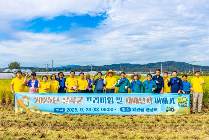 [한국기자연대] 칠곡군은 23일 왜관읍 금남리에서 ‘칠곡군 프리미엄 쌀 재배단지 벼베기 행사’를 개최했다.