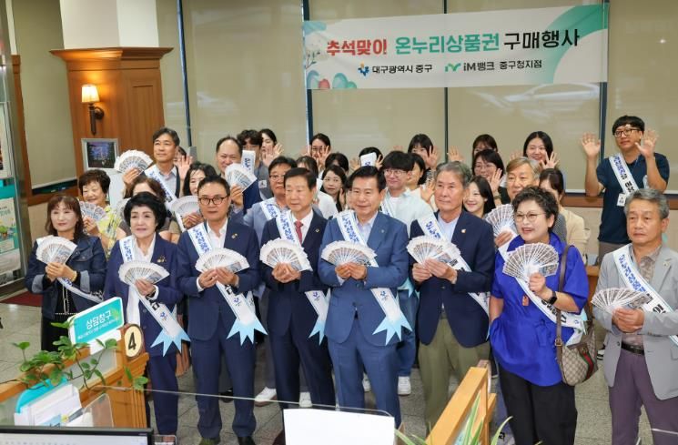 [한국기자연대] 대구 중구는 추석 명절을 앞둔 24일 아이엠뱅크(구 대구은행) 중구청 지점에서 전통시장 상인회장, 각급 협의단체장, 구의원 등이 함께 침체한 전통시장 활성화를 위한 ‘추석 맞이 온누리상품권 구매 행사’를 개최했다.