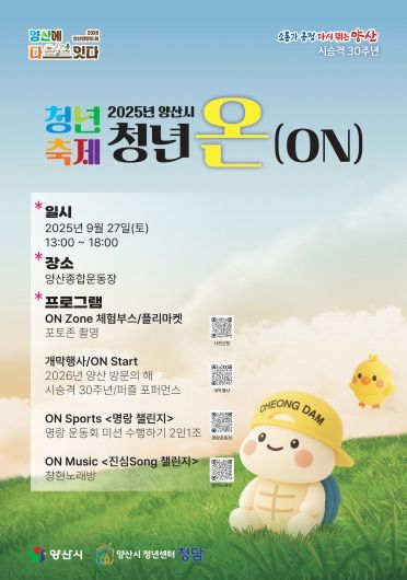 [한국기자연대] 양산시는 청년의 날과 청년주간을 맞아 오는 27일 오후 1시부터 양산종합운동장에서 '2025 양산시 청년축제 ‘청년 온(ON)’'을 개최한다고 밝혔다.