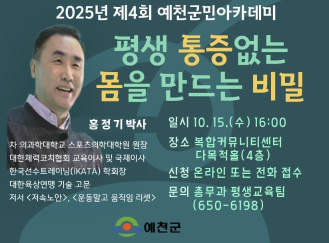 [한국기자연대] 예천군은 10월 15일 오후 4시, 복합커뮤니티센터 다목적홀에서 ‘2025년 제4회 예천군민 아카데미’를 개최한다.