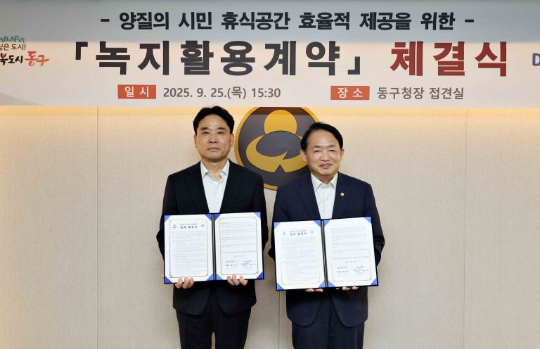 [한국기자연대] 인천 동구는 지난 25일 동원로엑스㈜(인천㈜ 대표이사 최안석)와‘녹지활용계약’을 체결했다고 밝혔다. 인천 최초로 진행된 이번 계약은 민간기업이 소유한 사유지를 주민에게 열린 녹지로 제공하는 새로운 방식의 민관 협력 모델이다.