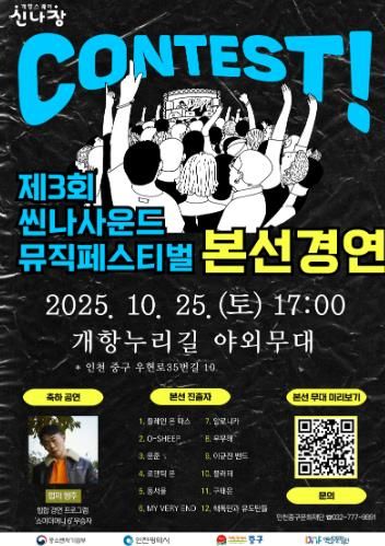 [한국기자연대] (재)인천중구문화재단은 오는 10월 25일 오후 5시 인천 중구 개항누리길 야외무대에서 ‘제3회 씬나사운드 뮤직 페스티벌’ 본선 경연을 개최한다고 밝혔다.