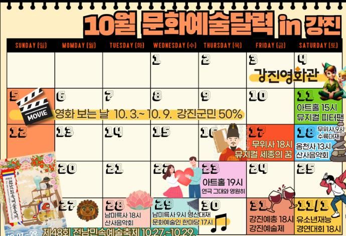 [한국기자연대] 강진군은 선선한 가을바람과 함께 군민의 문화적 감수성을 채워줄 다채로운 문화예술 행사를 10월 집중 운영한다고 29일 밝혔다.