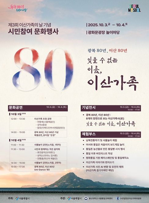 올해 행사는 광복 80주년을 맞아 이산 80년의 역사를 되돌아보는 전시와 이산가족의 날 국가기념일 취지에 맞춰 이산의 아픔을 겪고 있는 이산가족을 직접 초청해 위로하고, 이산가족 문제에 대해 시민 공감대를 확산할 수 있는 다양한 문화행사를 준비했다.