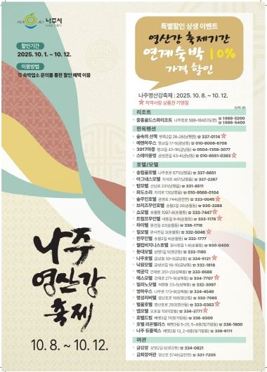 [한국기자연대] 전라남도 나주시가 오는 10월 8일부터 12일까지 열리는 ‘2025 나주영산강축제’ 기간 동안 지역 숙박업소와 함께하는 숙박 특별할인 상생 이벤트를 마련했다.