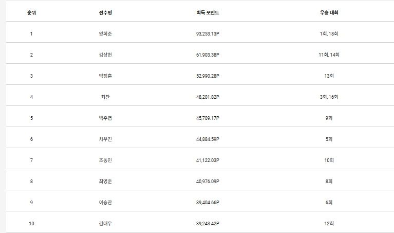 2위 김상현과 10위 김태우(27.(주)하이니스임플란트)의 포인트 격차는 22,659.96포인트다. 또한 10위 김태우와 13위 이승형(22), 17위 김범수(27)와 포인트 차는 각각 10,221.45포인트, 12,766.24포인트다. 10위 김태우와 20위 하충훈(35.㈜일신테크놀로지)와 차이는 16,500.06포인트다.