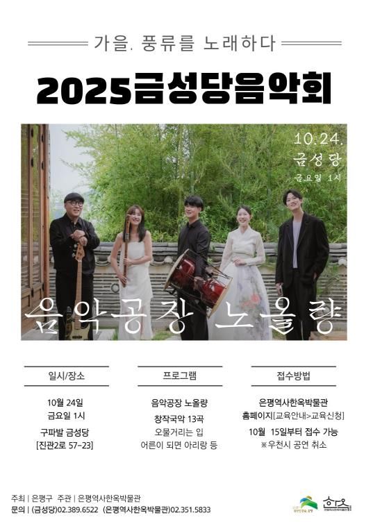 [한국기자연대] 서울 은평구는 10월 24일 오후 1시 은평뉴타운 아파트 숲 사이에 자리한 금성당에서 ‘음악회’를 개최한다고 밝혔다.