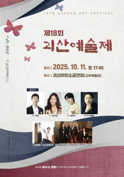 박진수 괴산군 문화체육관광과장은 “괴산예술제를 통해 무더위에 지친 군민들께 따뜻한 감동과 위안을 전하고 싶다”며 “앞으로도 문화예술을 통해 활력 넘치는 괴산군을 만들어 가겠다”고 말했다.