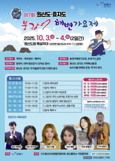 [한국기자연대] 보령시가 주최하고 (사)원산도관광발전협의회가 주관하는 ‘제7회 원산도·효자도 붕장어 해변가요제’가 오는 10월 3일부터 4일까지 2일간 원산도항 특설무대에서 개최된다.