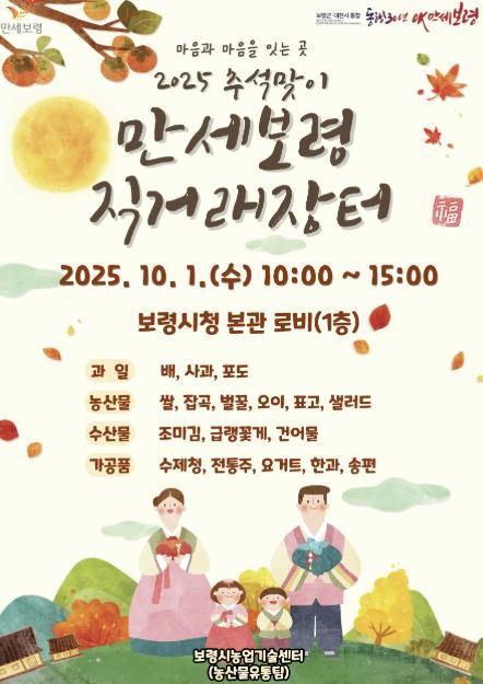[한국기자연대] 보령시는 추석을 맞아 10월 1일 보령시청 본관 1층 로비에서 ‘2025 추석맞이 만세보령 농특산물 직거래장터’를 운영한다고 밝혔다.