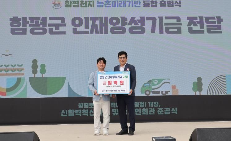 함평군은 30일 “고기사랑(주) 농업회사법인 및 함평축산물종합처리장 이동우 대표가 지난 26일 함평자동차극장에서 개최된 ‘함평천지 농촌미래기반 통합 출범식’ 행사 중 인재양성기금에 1억 원을 쾌척했다”고 밝혔다.