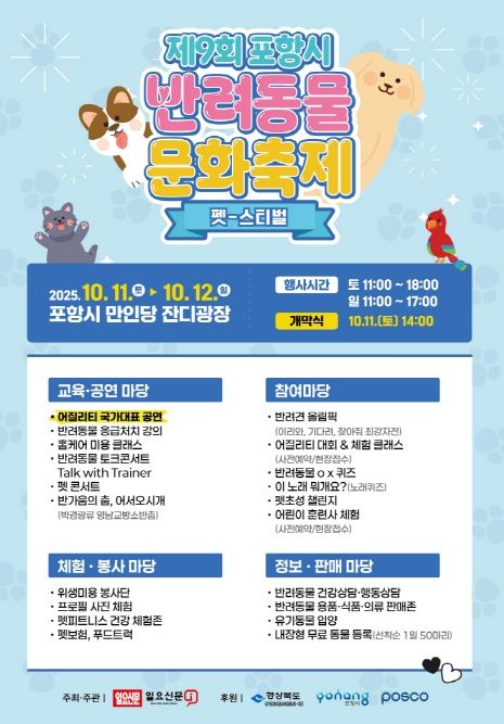 [한국기자연대] 포항시는 오는 10월 11일부터 12일까지 만인당 잔디광장에서 ‘제9회 포항시 반려동물 문화축제’를 개최한다.