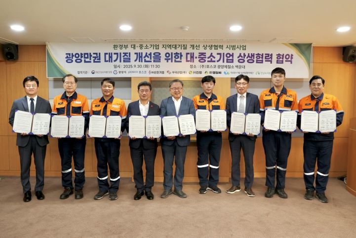 [한국기자연대] 광양시와 영산강유역환경청은 9월 30일 국내 최대 철강업체인 ㈜포스코 광양제철소와 협력업체 4개사가 광양만권 지역 대기질 개선을 위해 ‘광양만권 대․중․소기업 지역 대기질 개선 상생협력 협약’을 체결했다고 밝혔다.