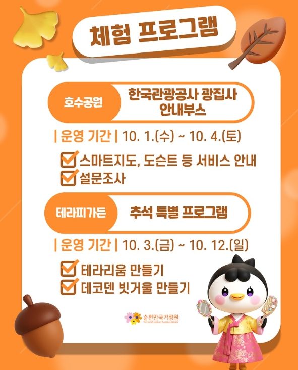 노관규 순천시장은 “올해 추석은 봉화언덕 위 보름달에 소망을 담고, 가족의 웃음으로 정원을 가득 채울 수 있는 축제로 준비했다”며 “세대가 함께 즐길 수 있는 체험과 공연, 전통 놀이가 어우러진 이번 한가위 특별 프로그램을 통해 시민과 관광객 모두 온 가족이 함께하는 행복한 명절을 보내시기를 바란다”고 말했다.