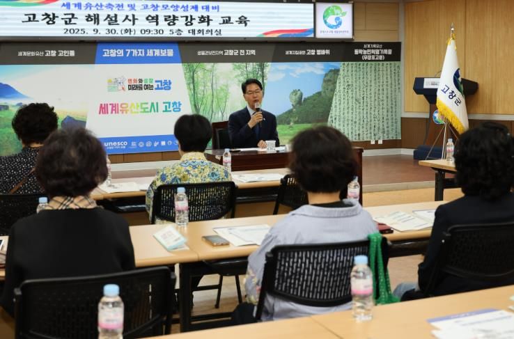 [한국기자연대] 고창군이 30일 군청 5층 회의실에서 ‘2025 세계유산축전(10월2~22일)’과 ‘제52회 고창모양성제(10월29일~11월2일)’를 앞두고 해설사 친절교육을 실시했다.