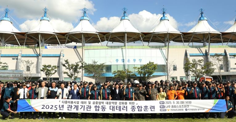 [한국기자연대] 전남경찰청은 나주종합스포츠파크에서 국가정보원(광주지부), 육군 제31보병사단, 제11공수특전여단, 공군 제1전투비행단, 전남소방본부, 영산강유역환경청 등 10개 기관 250여명이 참여한 가운데 관계기관 합동 대테러 종합훈련을 실시했다.