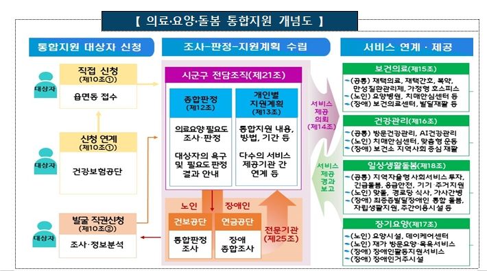 이러한 환경변화 및 요구에 대응하기 위해, 정부는 시범사업 등 통합돌봄의 제도화를 추진해 왔으며, 일상생활 수행에 어려움을 겪는 사람이 살던 곳에서 건강한 생활을 영위하도록 의료·요양·돌봄 서비스를 통합·연계하는 '의료·요양 등 지역 돌봄의 통합지원에 관한 법률(돌봄통합지원법)'이 ’24년 3월 제정되어 내년 3월 전국적인 본사업 시행을 앞두고 있다.