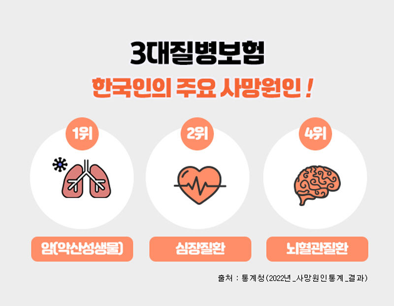 [한국기자연대] 3대질병으로 일컬어지는 암, 뇌혈관질환, 심혈관질환은 한국인의 주요 사망원인에서 상위를 차지하고 있으며, 이에 대한 진단비를 집중적으로 보장해 주는 보험상품을 3대질병진단비 보험이라 할 수 있다.