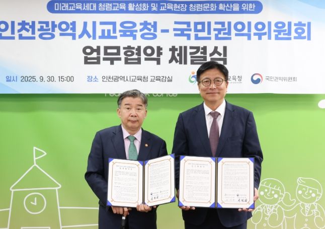 [한국기자연대] 인천광역시교육청은 9월 30일 국민권익위원회와 청렴한 미래인재 양성과 교육 현장의 청렴 문화 확산을 위한 업무협약을 체결했다.