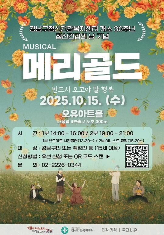 [한국기자연대] 꿈이 모이는 도시, 미래를 그리는 강남구가 정신건강복지센터 개소 30주년과 세계정신건강의 날(10월 10일)을 기념해, 오는 10월 15일 오후 2시와 7시, 오유아트홀(남부순환로378길 34-9)에서 구민과 함께하는 특별 뮤지컬 ‘메리골드 – 반드시 오고야 말 행복’을 개최한다.