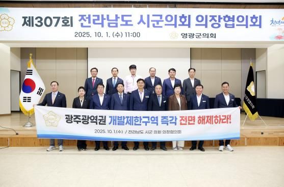 [한국기자연대] 전라남도 시군 의회 의장협의회는 지난 10월 1일 영광군의회에서 개최된 제307회 정례회의에서“광주광역권 개발제한구역 전면 해제 촉구 건의안”을 만장일치로 채택했다.