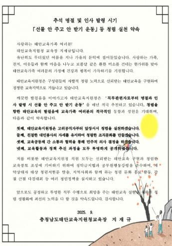 [한국기자연대] 충청남도태안교육지원청은 추석 연휴 시기를 맞아 청렴한 공직문화를 확산하기 위해 ‘선물 안 주고 안 받기 운동’을 강조하는 청렴 서한문을 홈페이지에 게시했다.