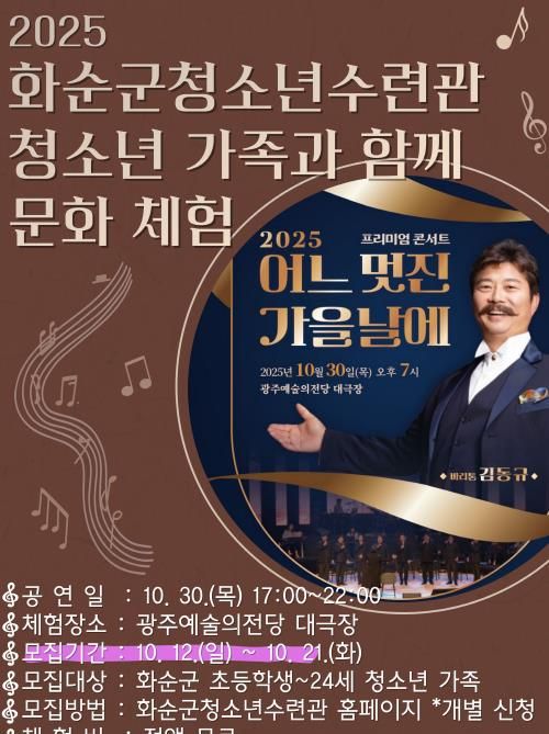 [한국기자연대] 화순군은 2일 청소년수련관에서 짙어가는 가을의 정취 속에 청소년과 가족이 함께하는 특별한 문화체험, 바리톤 김동규의 프리미엄 콘서트'어느 멋진 가을날'을 관람할 청소년 가족 60명을 선착순 모집한다고 밝혔다.